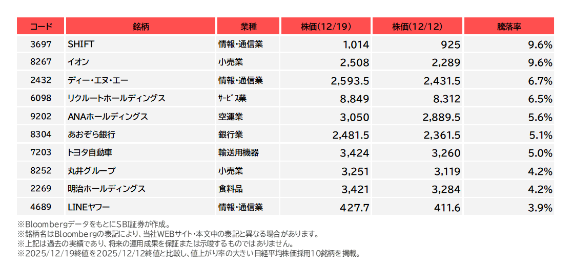図表3 日経平均株価採用銘柄の騰落率上位(12/12-12/19)
