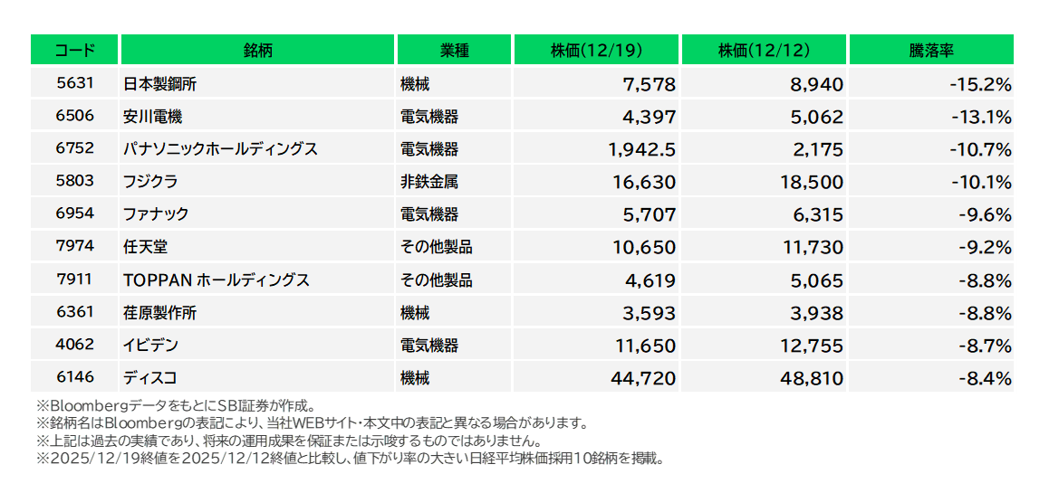 図表4 日経平均株価採用銘柄の騰落率下位(12/12-12/19)