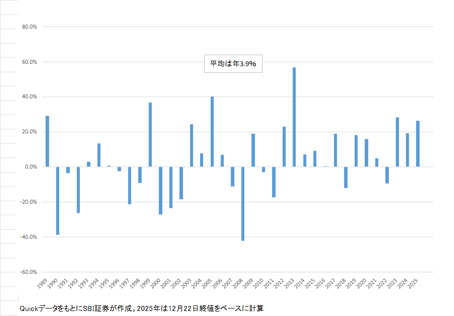 図表5 日経平均株価の年間騰落率(1989~2025年)
