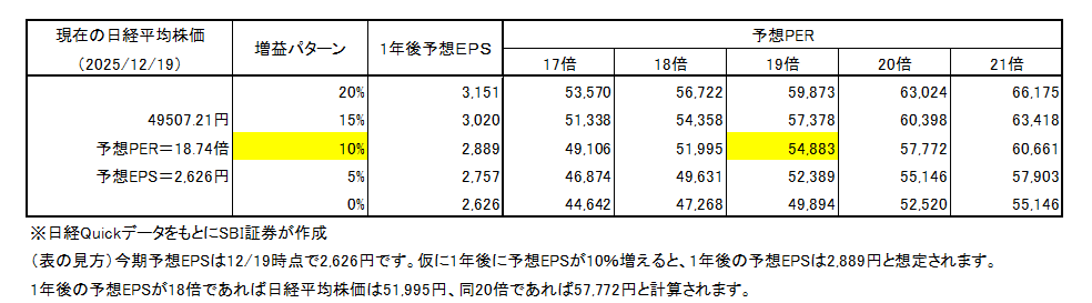 この前提に基づくと、1年後の予想EPSは現在より1割増えて2,889円となり、現在の予想PER(18.74倍)に近い19倍を掛けると、想定日経平均株価は約5万5千円となります。企業業績や財務指標を基に考えれば、2026年の日経平均株価は「10%程度の上昇余地」は十分に見込めるのではないでしょうか。
