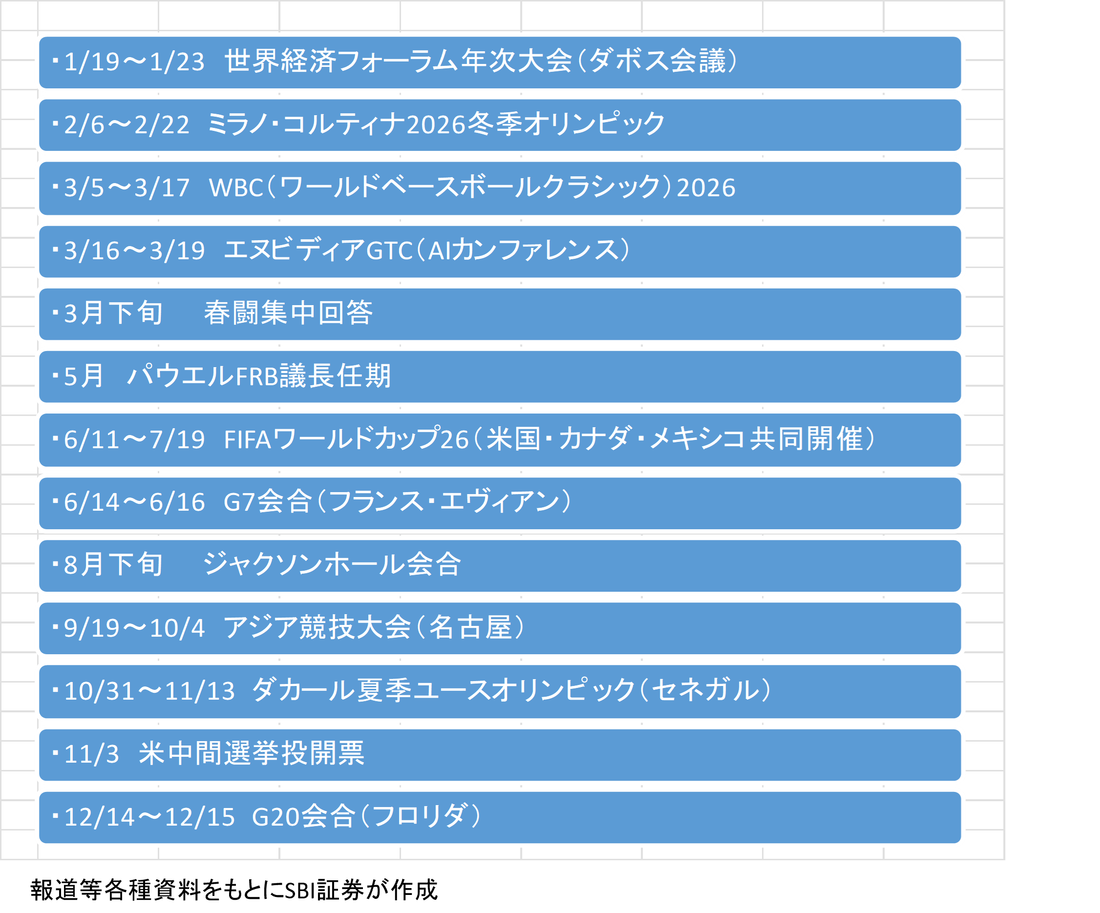 スポーツイベントが数多く開催を予定されていることも特徴的です。「スポーツ関連株」は2026年の隠れた投資テーマになるかもしれません。