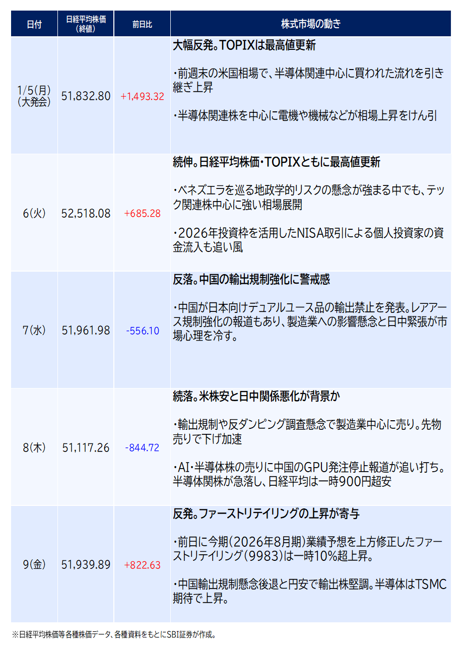 日経平均株価の1/9(金)終値は51,939円89銭で、前年末比1,600円41銭高(+3.17%)と週足ベースで続伸。