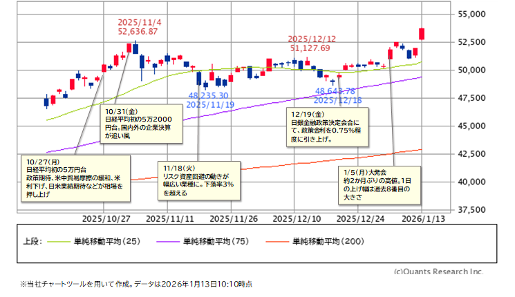 年初の日本株市場は、まさに「丙午」の幕開け”を思わせる大きな動きとなりました。米国株はAI関連を中心に堅調で、金利環境も落ち着きを見せています。1/13(火)はさらに、国内では解散総選挙の可能性が意識され始め、政策運営の明確化や経済対策への期待が先物市場に先行して織り込まれる展開です。海外・国内のプラス要因が重なったことで、CME日経先物(現地時間1/9・1/12)は急騰し、日本市場は大幅なギャップアップ(窓を開けた上昇)で取引を開始しています。