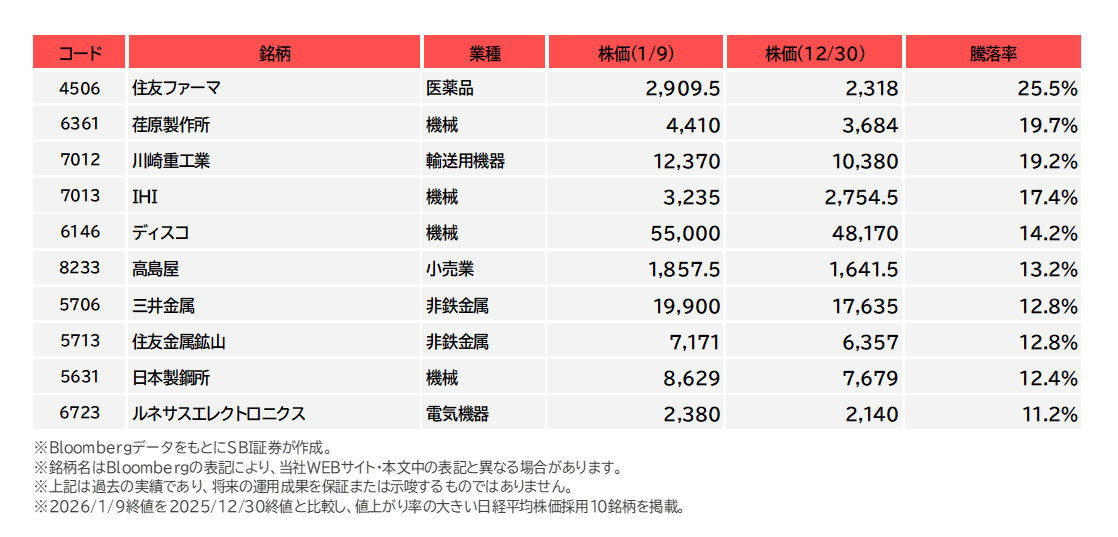 図表4 日経平均株価採用銘柄の騰落率上位(2025/12/30-2026/1/9)
