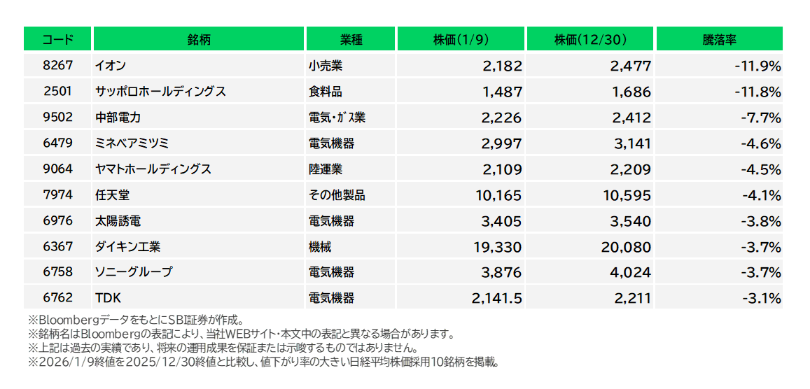 図表5 日経平均株価採用銘柄の騰落率下位(2025/12/30-2026/1/9)