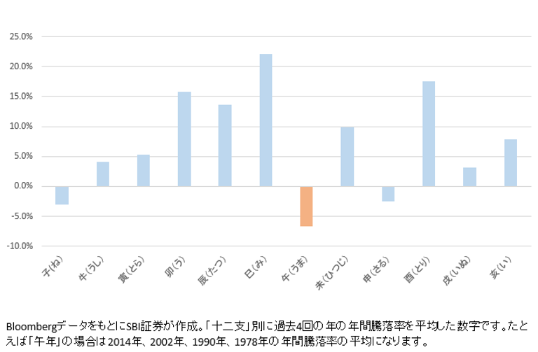 相場格言に根拠がないわけではなさそうです。図表6は「十二支」別平均年騰落率(過去4回)をグラフにしたものです。過去4回の「午年」は2014年、2002年、1990年、1978年であり、それらの年間騰落率を示したのが図表6のオレンジ色の棒グラフということになります。