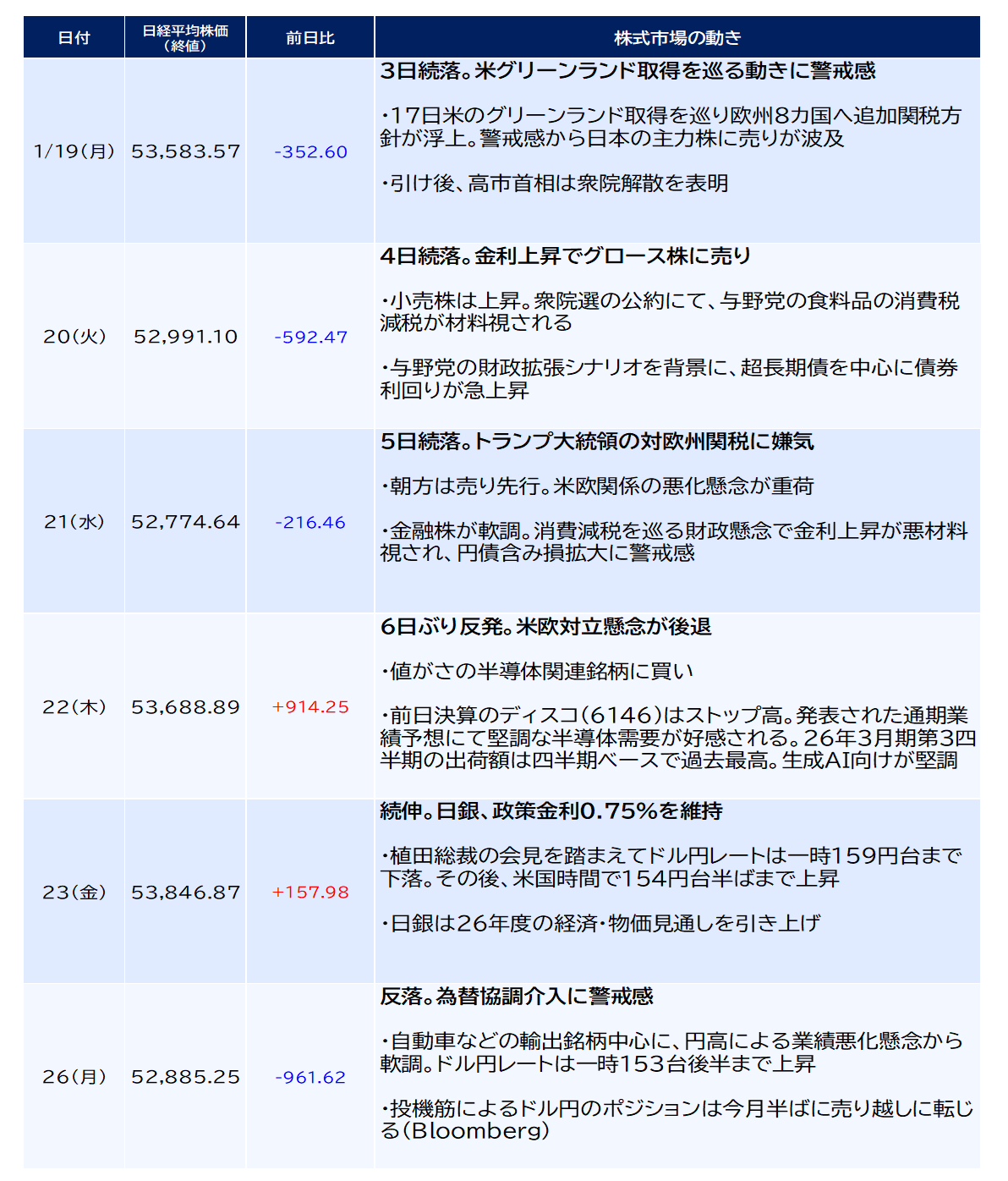 先週の米国株式市場は、米国のグリーンランド買収に反対する欧州諸国に10%の追加関税を課すとして1/20(火)に急落、その後トランプ大統領が追加関税は撤回するとして反発に転じましたが、週間ではマイナスとなりました。今週の株価材料として、10-...
