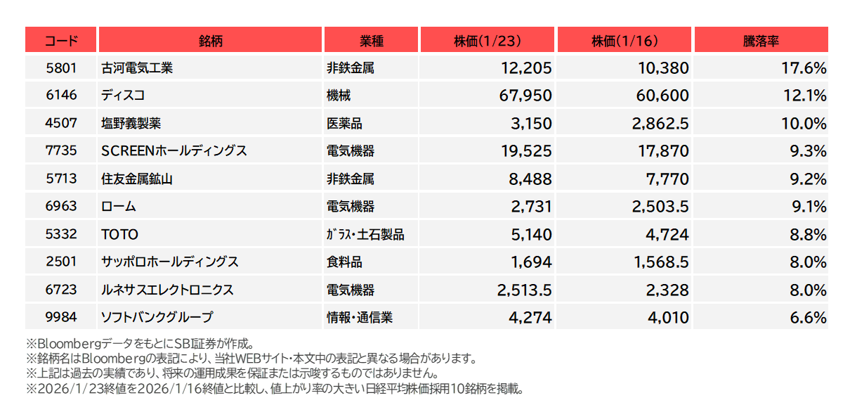 図表4 日経平均株価採用銘柄の騰落率上位(1/16-1/23)