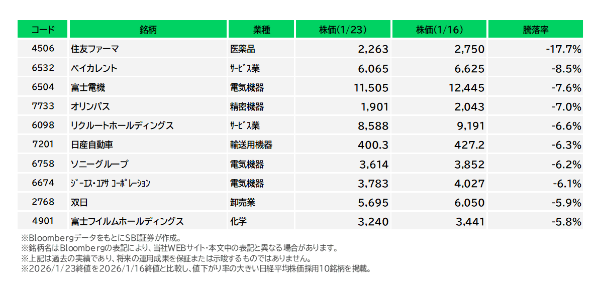 ・下落率上位:住友ファーマ(4506)は、北米事業のけん引で26年3月期業績予想は大幅増益へ上方修正。株価は年初来急騰していたこともあり、足元は決算前のポジション調整と考えられます。1/30(金)決算に注目が集まります。