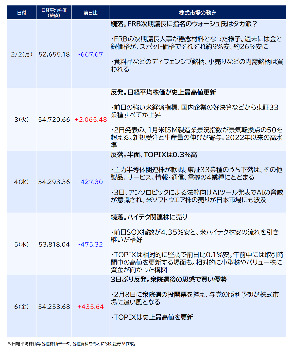 日経平均株価の2/6(金)終値は54,253円68銭で、前週末比930円83銭(1.74%)高と週足ベースで反発。