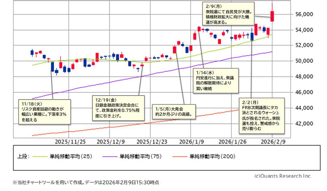 2/8(日)衆院選の投開票にて、自民党は316議席を獲得し歴史的大勝となりました。与党で衆院の 3分の2超 を確保し、法案の再可決や憲法改正の発議が可能となりました。政治の安定期待から、市場では政権の政策が迅速に進むとの見方が強まっています。