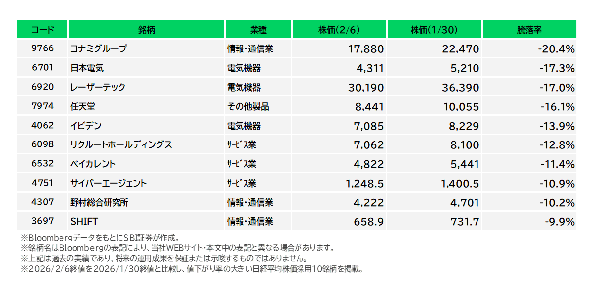 図表5 日経平均株価採用銘柄の騰落率下位(1/30-2/6)