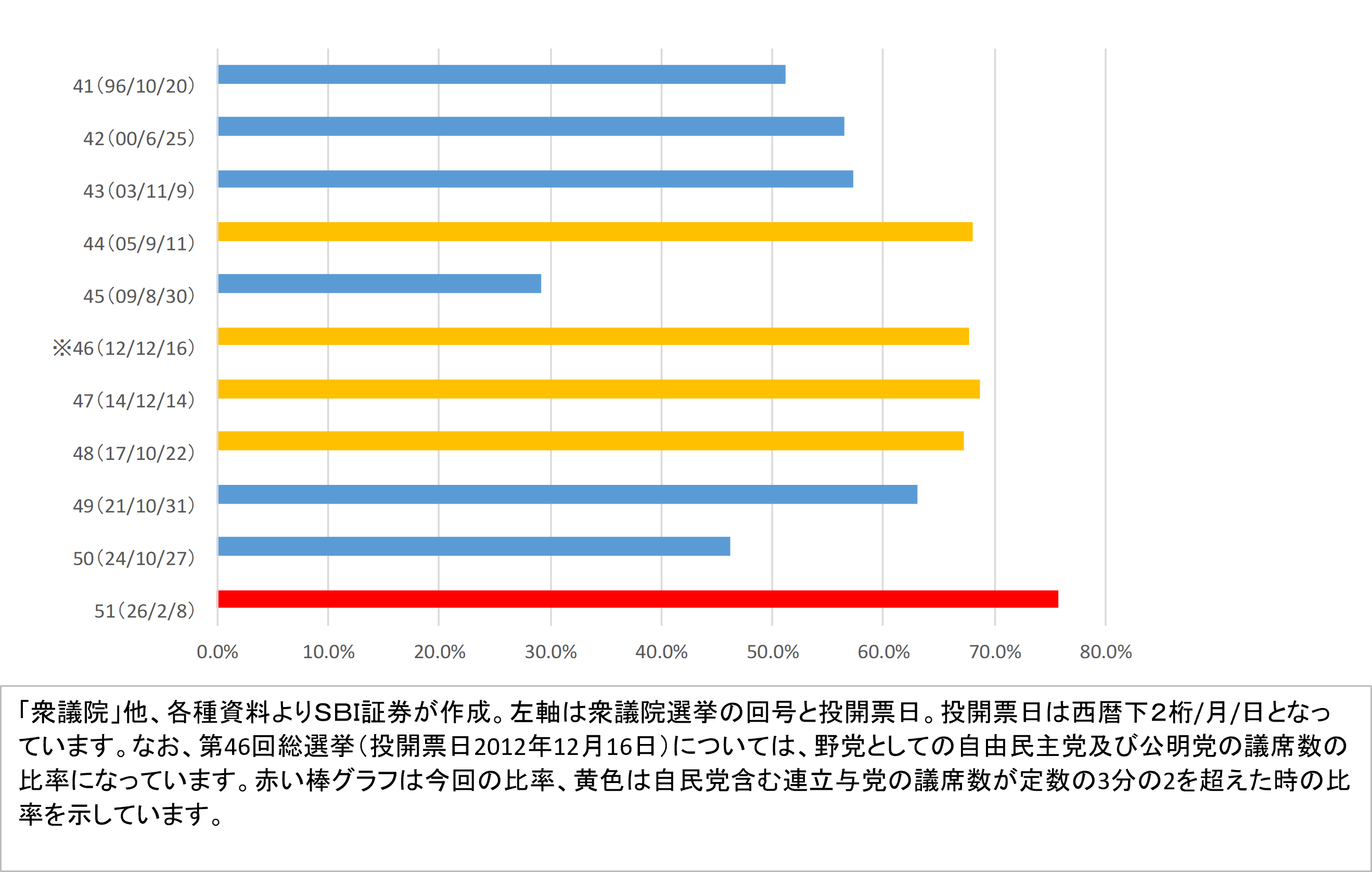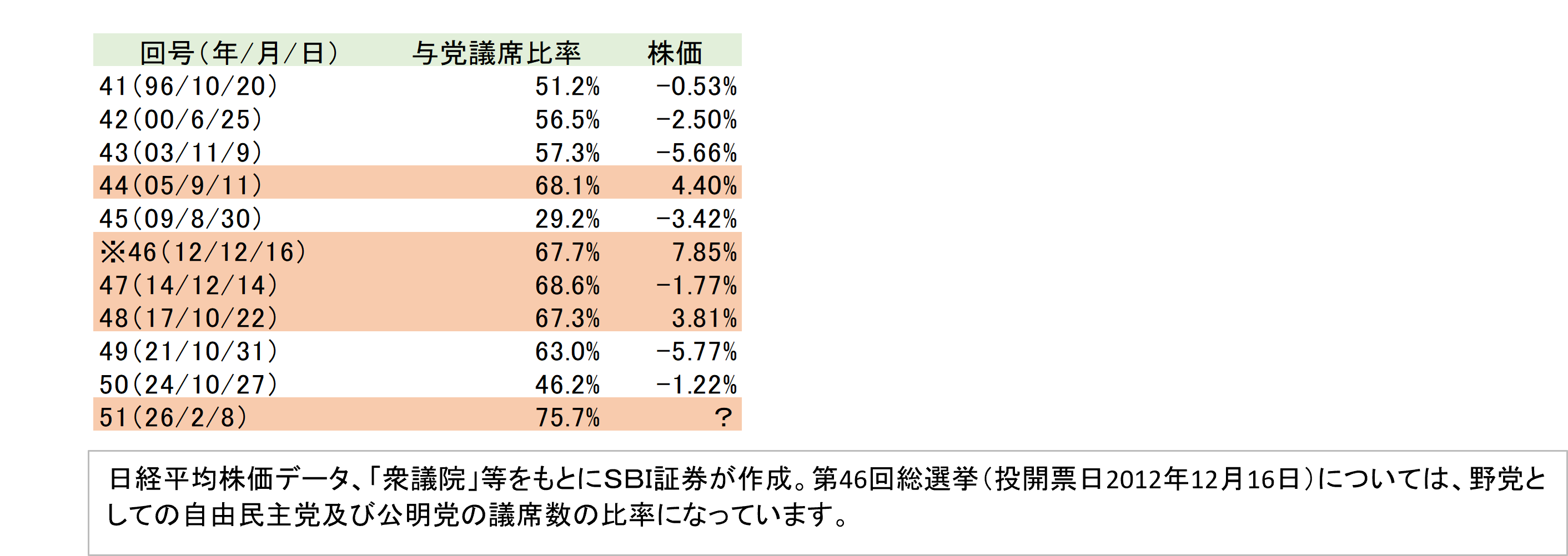 ただ、やや視点を変え「政権与党が定数の3分の2を確保した場合」の日経平均株価のパフォーマンスを見た場合、図表8が参考になります。なんと、小選挙区比例代表制が採用された第41回総選挙以降、投開票日から31日後の日経平均株価が下落するのは、与党獲得議席比率が3分の2を切ったときに限られています。逆に、与党の比率が3分の2(66.7%)を上回った場合、勝敗では3勝1敗、平均3.1%上昇という好パフォーマンスになっています。
