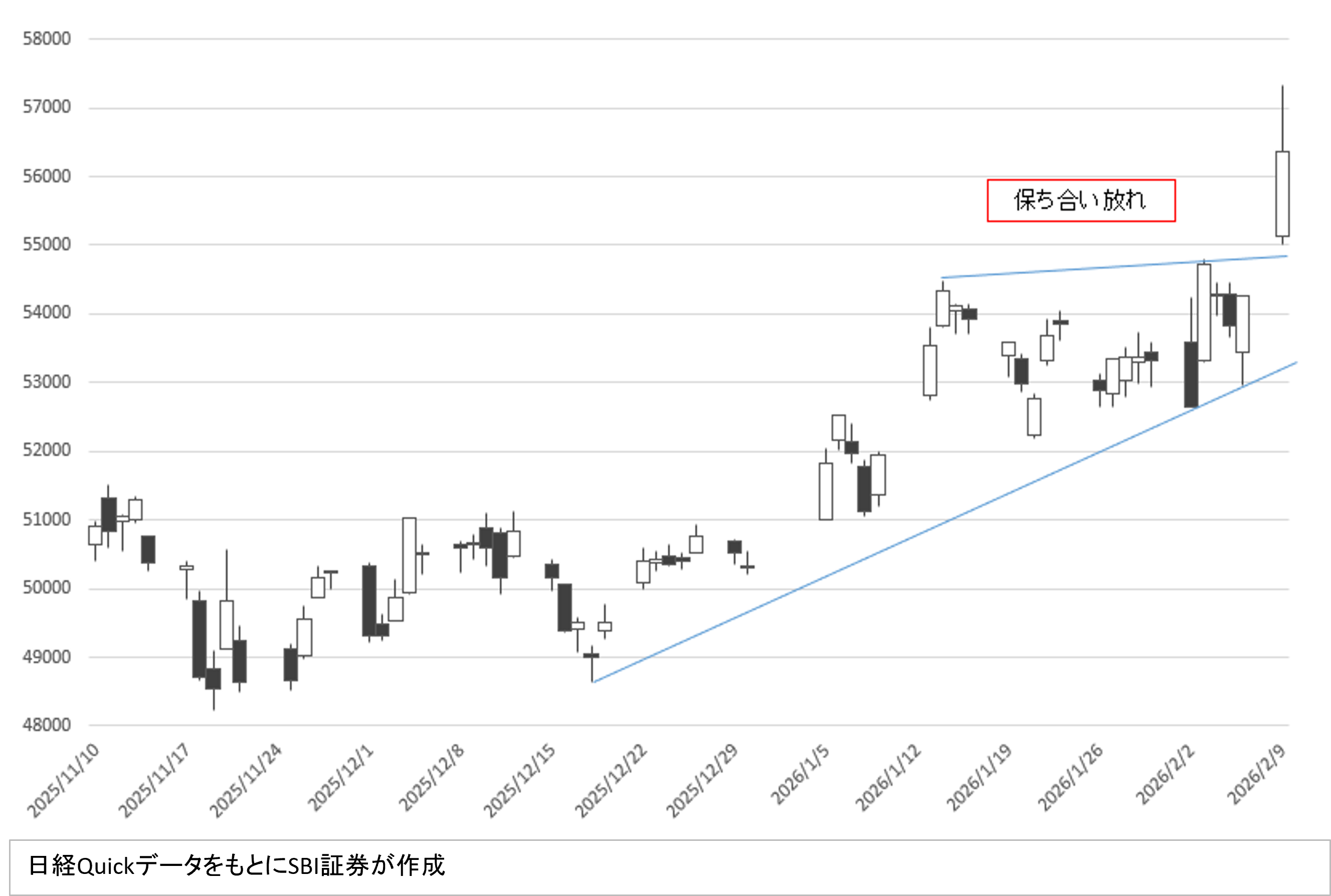 今後はどうなるでしょうか。前週末2月6日(金)時点の日経平均株価は25日移動平均線に絡んだ動きで「三角保ち合い」の範囲内にありました。2月9日の大幅高によりそこから「上放れ」となった形であり、過熱感よりも先高観を意識させるチャート形状のように見受けられます。日経平均株価は、安定した高市政権を前提とした一段上のレンジに移行した可能性があります。半面、日経平均株価の予想PERが20倍を超えてきたことで利益確定売りも増えそうです。日経平均株価が6万円まで上昇するには、多少時間が必要かもしれません。