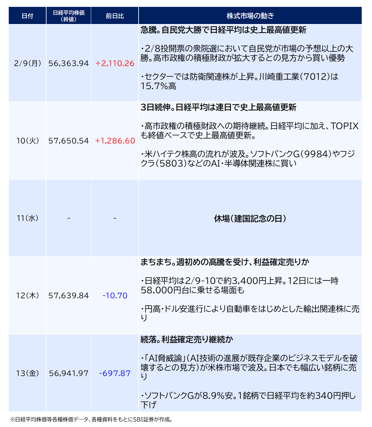 日経平均株価の2/13(金)終値は56,941円97銭で、前週末比2,688円29銭(+4.96%)と週足ベースで大幅上昇。