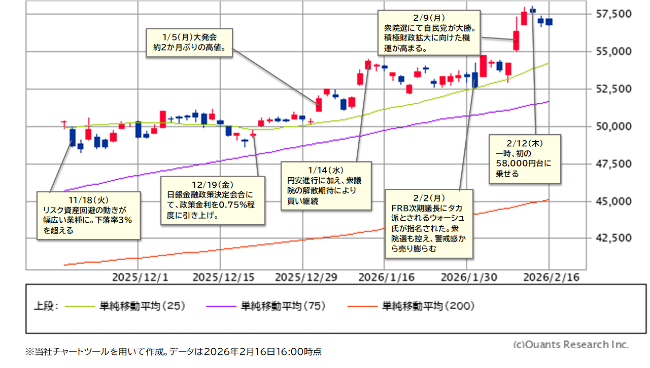 日経平均株価の2/16(月)終値は56,806円41銭で、前週末比135円56銭安(-0.24%)と小幅に続落。