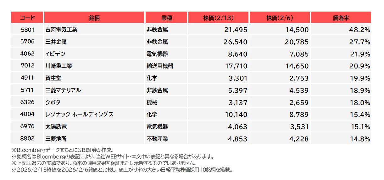 図表4 日経平均株価採用銘柄の騰落率上位(2/6-2/13)