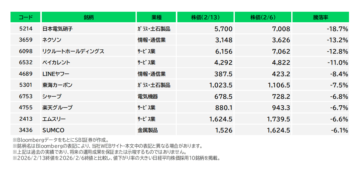 図表5 日経平均株価採用銘柄の騰落率下位(2/6-2/13)