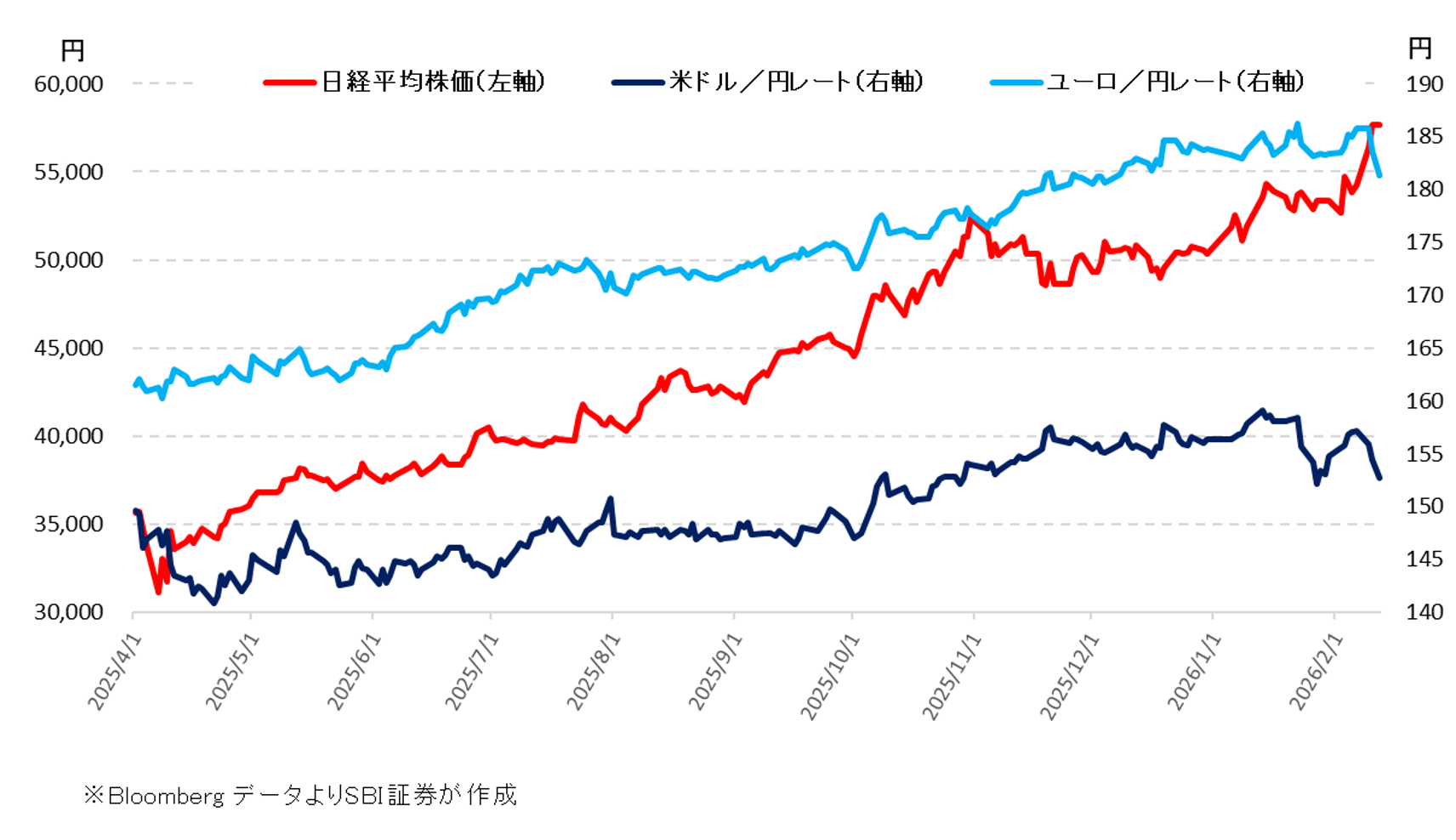 図表6 日経平均株価と米ドル/円レート、ユーロ/円レート(2025/4/1~2026/2/13)