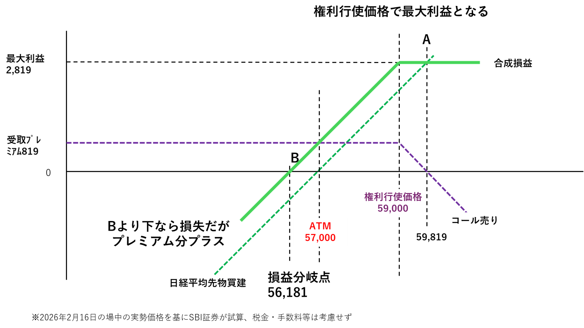 この結果、最大利益は@2,819 × 100 = 281,900円で固定され、それ以上の上昇益は放棄することになります。しかし、A点である59,819円までは、単純な先物買いよりも合成損益が上回ります。
