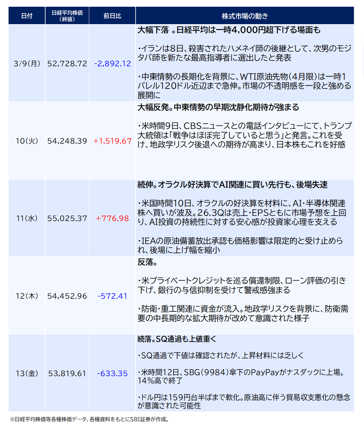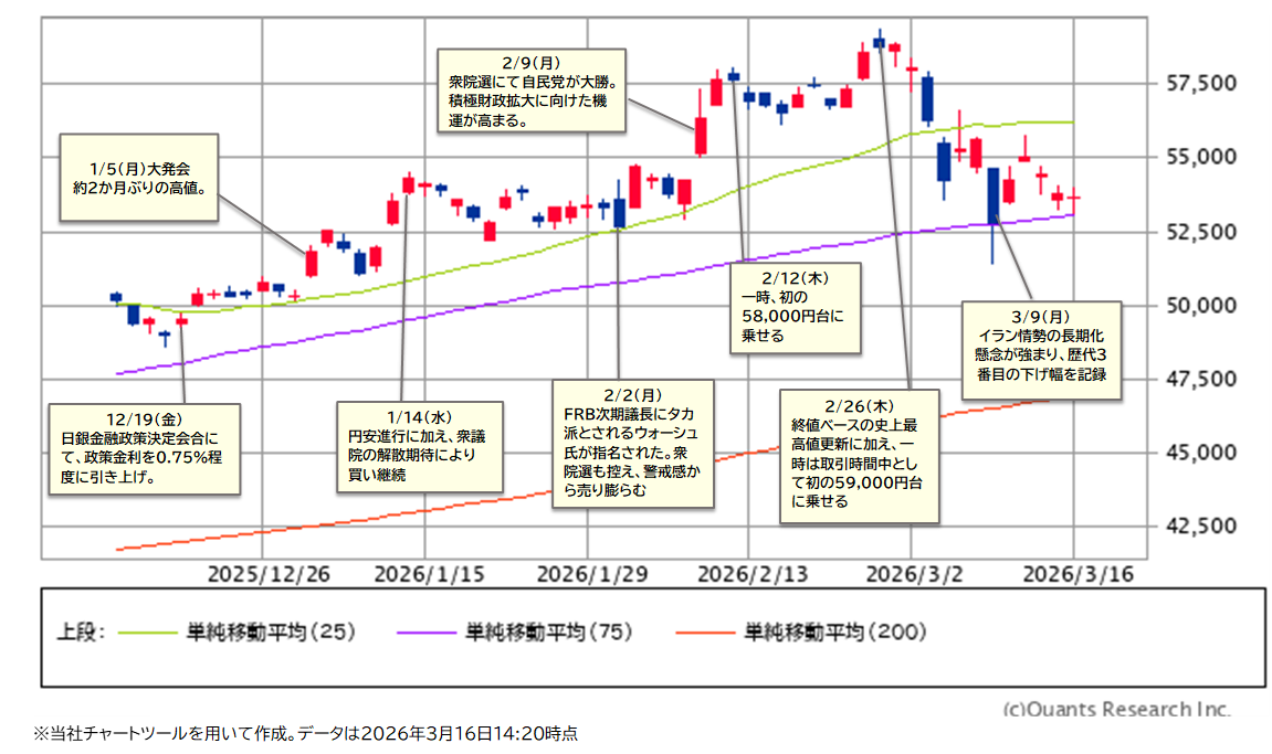 日経平均株価の3/13(金)終値は53,819円61銭で、前週末比-1,801円23銭安(-3.24%)と週足ベースで続落。