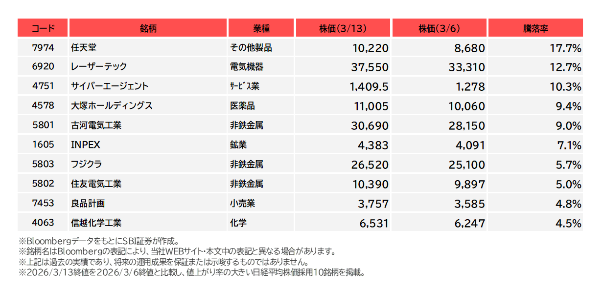 図表4 日経平均株価採用銘柄の騰落率上位(3/6-3/13)