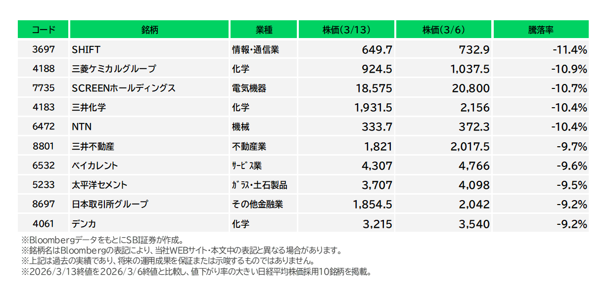 図表5 日経平均株価採用銘柄の騰落率下位(3/6-3/13)