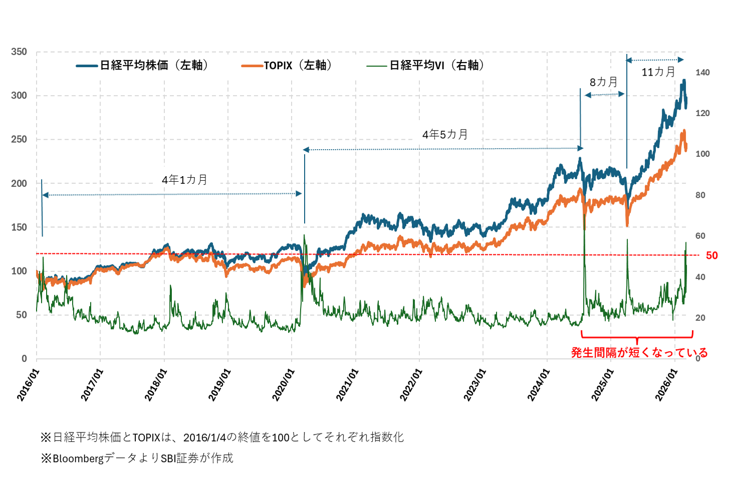 図表6 日経平均、TOPIXと日経平均VI(2016/1/4~2026/3/13)