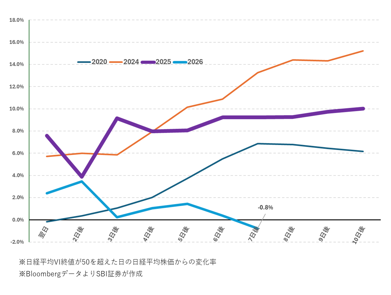 発生間隔が短いだけでなく、大底確認の目安となることが多かった日経平均VIが50を超えても(図表6の赤点線)、今回の「中東ショック」後の日経平均の値動きは今までと異なっています。図表7は日経平均VIが50を超えた日を起点として、その日からの日経平均株価の累計変化率を示したものです。2020年のコロナショックでは原因がパンデミックで混乱が続いていたためか回復がゆっくりでしたが、2024年8月の株価急落や2025年4月のトランプ関税ショックでは、日経平均VI(終値)が50を超えた日から急速に株価が戻しています。