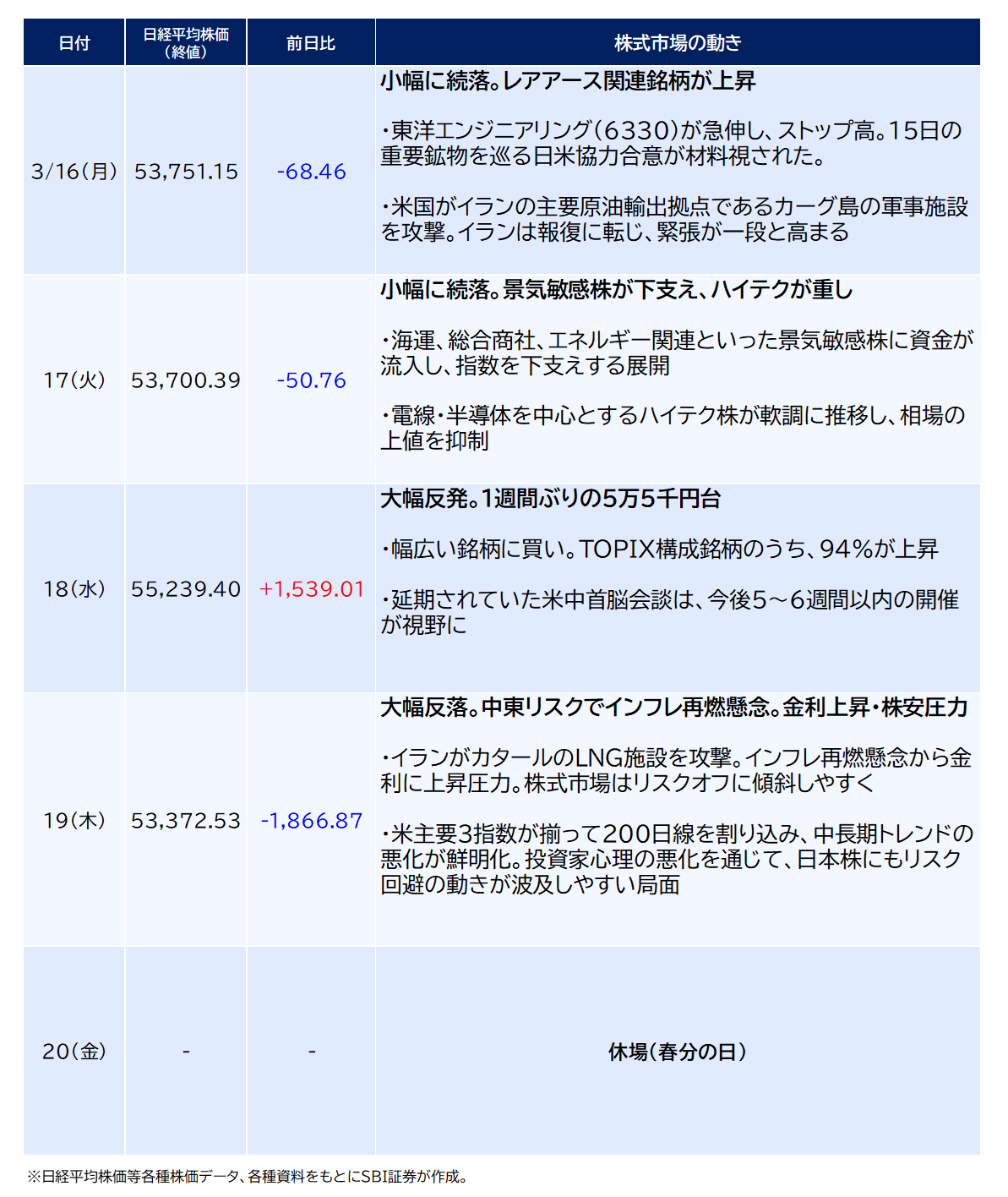 日経平均株価の3/19(木)終値は53,372円53銭で、前週末比-447円08銭安(-0.83%)と週足ベースで続落となりました。週前半は、資源・景気敏感株が支える一方、ハイテク株の弱さが重しとなり軟調に推移。3/18(水)には中東情勢への過度な警戒感の後退を背景に、大幅反発したものの、3/19(木)は中東情勢の緊迫化と米株式のテクニカル悪化を受けてリスクオフ姿勢が強まり、下押し圧力の強い展開となりました。