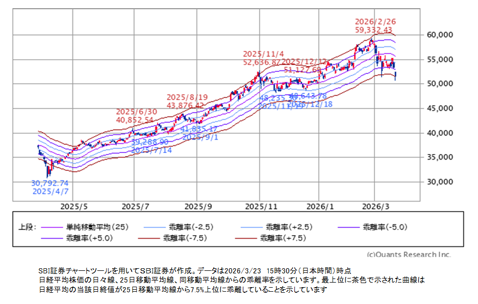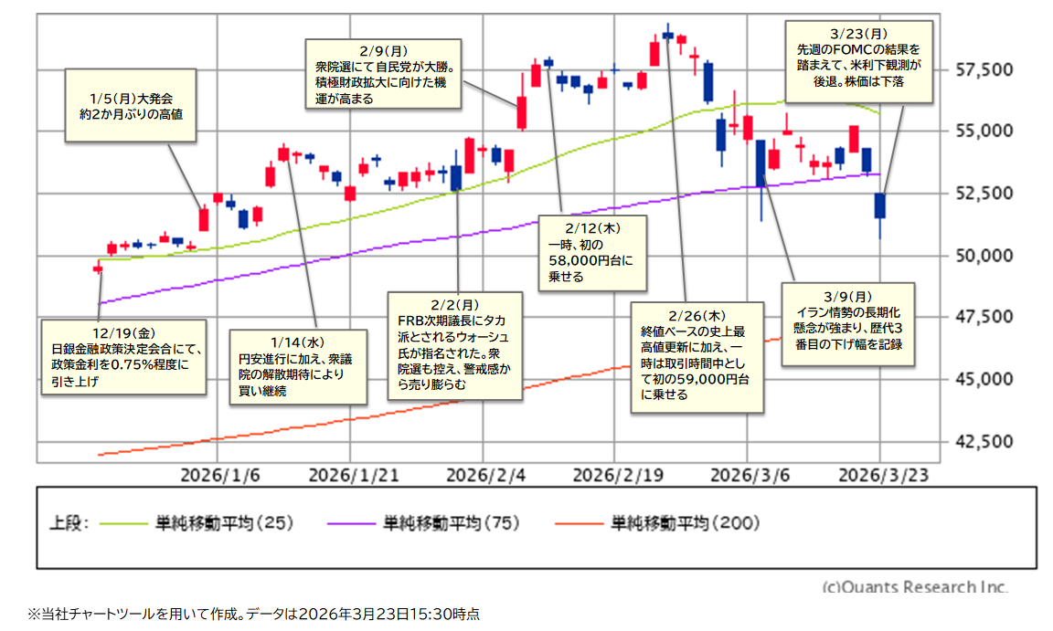 日経平均株価の3/23(月)終値は51,515円49銭で、前週末比1,857円04銭安(-3.48%)と下落。TOPIXは2/27(金)の史上最高値から下落率が10%を超え、テクニカル面で調整局面入りが意識されました。この日は日経平均株価も一時、前週末比2,600円超下落し、約2カ月半ぶりに5万1,000円を割り込む展開となりました。