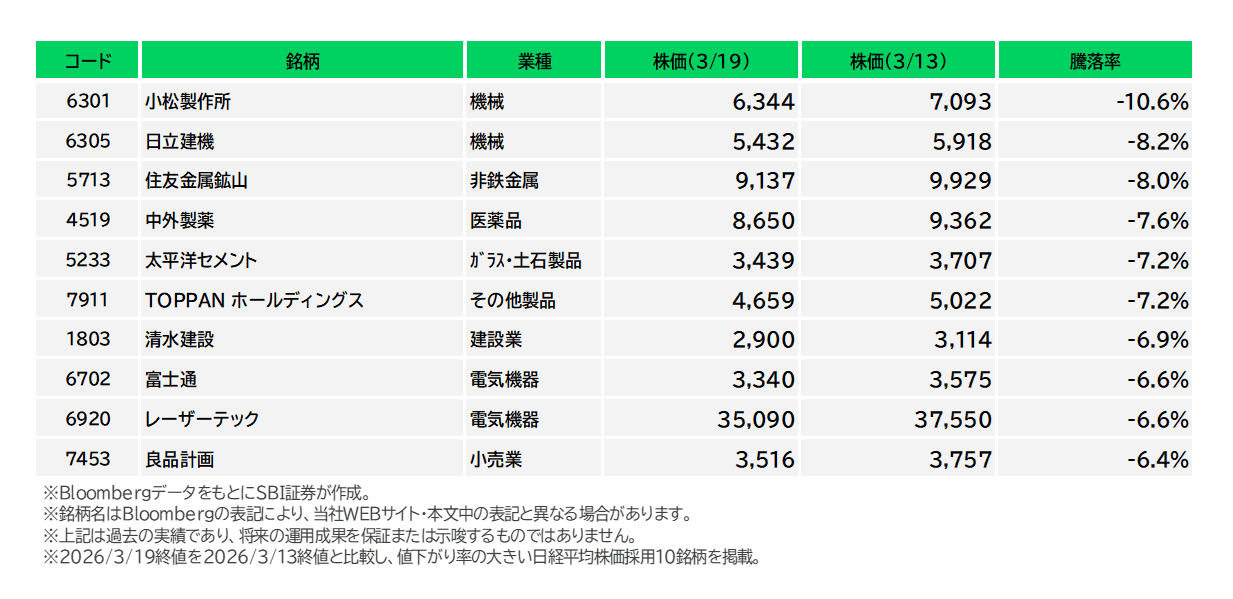 図表5 日経平均株価採用銘柄の騰落率下位(3/13-3/19)