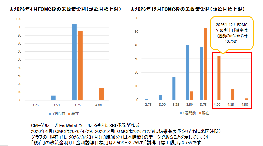 日本時間3/23(月)13時30分時点における、米金融政策の織り込み状況を示す「Fedウオッチ」(図表6)を見ると、米金融緩和期待の後退を受け、米国では長期金利が上昇しました。金利面での米国の魅力が回復方向に向かったこともあり、安全資産とされてきた金先物価格は急落するなど、金融市場は全体として波乱含みの動きとなっています。