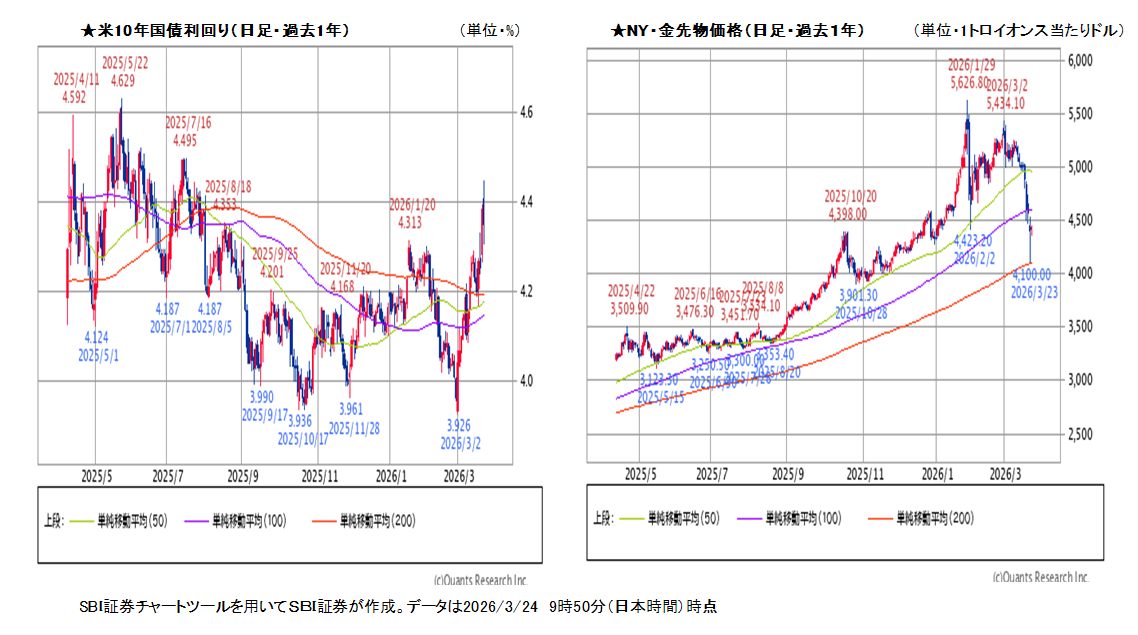 図表7 3月に入り米10年国債利回りは上昇し、金先物価格は下落