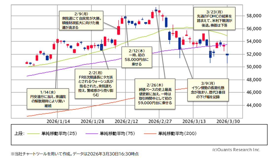 日経平均株価の3/30(月)終値は51,885円85銭で、前週末比1,487円22銭安(-2.79%)と大幅下落。