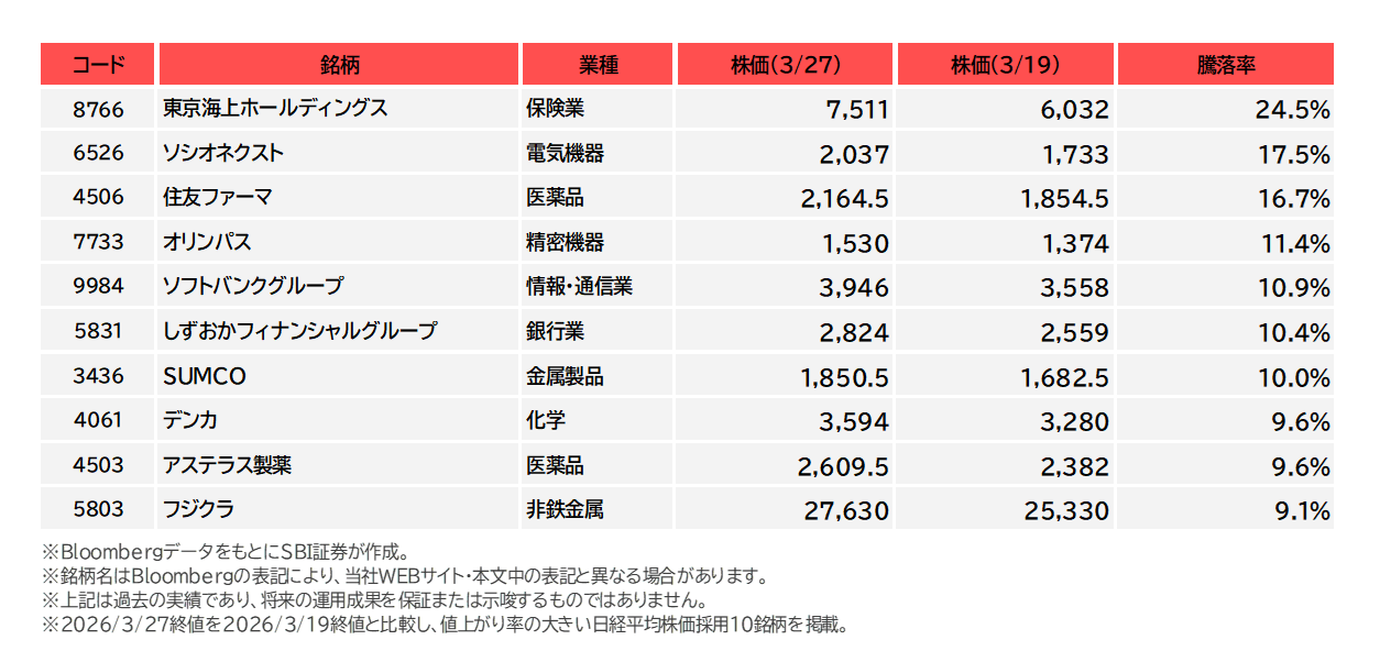 図表4 日経平均株価採用銘柄の騰落率上位(3/19-3/27)