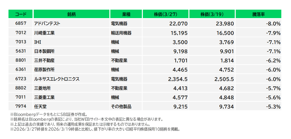 図表5 日経平均株価採用銘柄の騰落率下位(3/19-3/27)