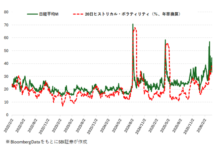 図表6 日経平均VIと20日ヒストリカル・ボラティリティ(2022/2/2~2026/3/27)