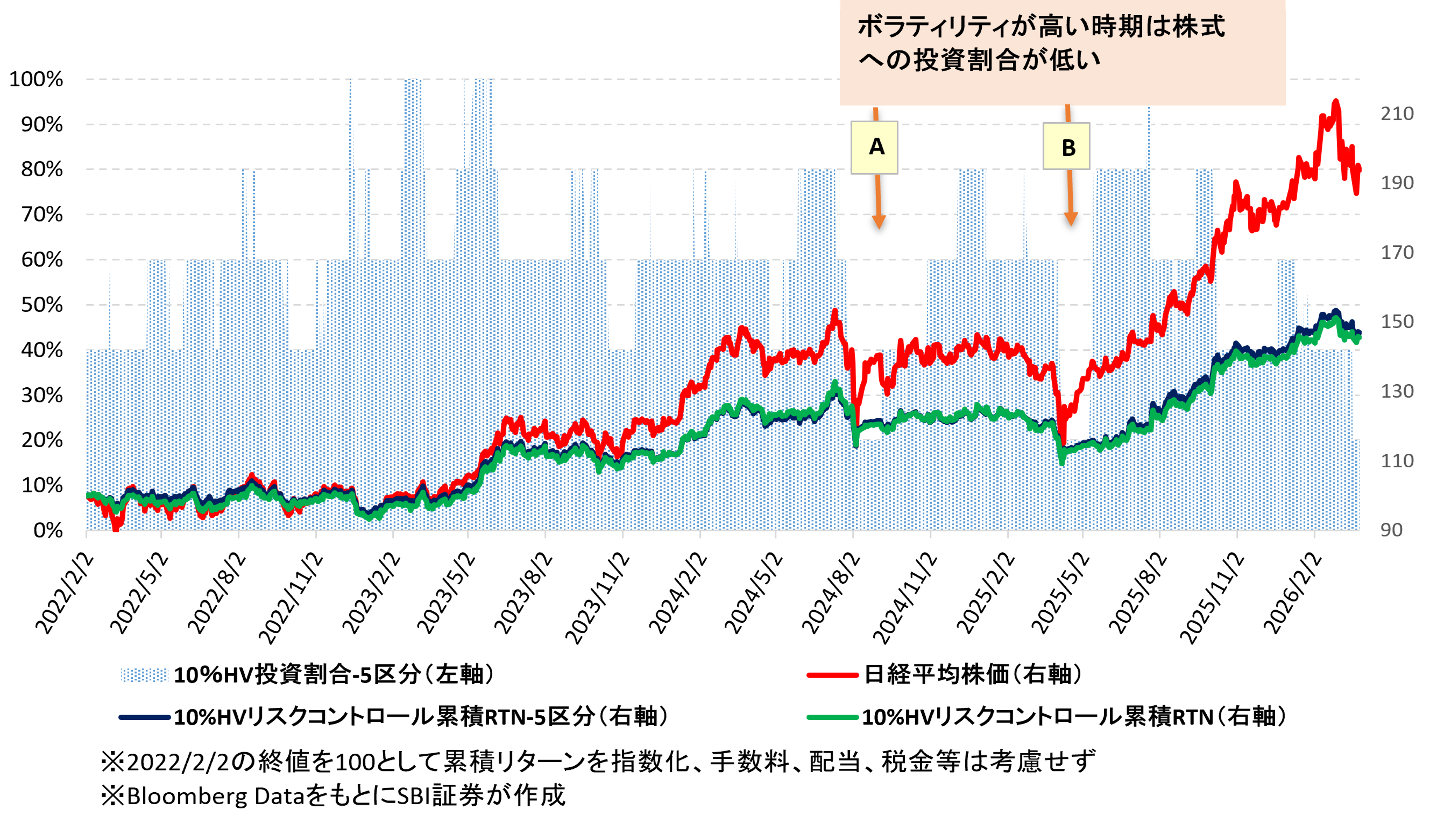 図表2は日経平均株価にそのまま投資していた場合と、10%リスクコントロール戦略を用いた場合の試算結果です(2022/2/2~2026/3/27)。10%リスクコントロール戦略は、リスク資産への投資割合を1%刻みとした場合(緑線)と5区分(0%~100%、20%刻み、黒線)の2通り試算しています。「10%HV投資割合-5区分」(面グラフ)はヒストリカル・ボラティリティ(HV)を用いた10%リスクコントロール戦略で、投資割合を5区分とした場合の推移です。この試算結果からは以下のことが分かります。ただし、あくまで過去の値動きに基づく試算であり、将来の運用成果等を保証するものではありません。