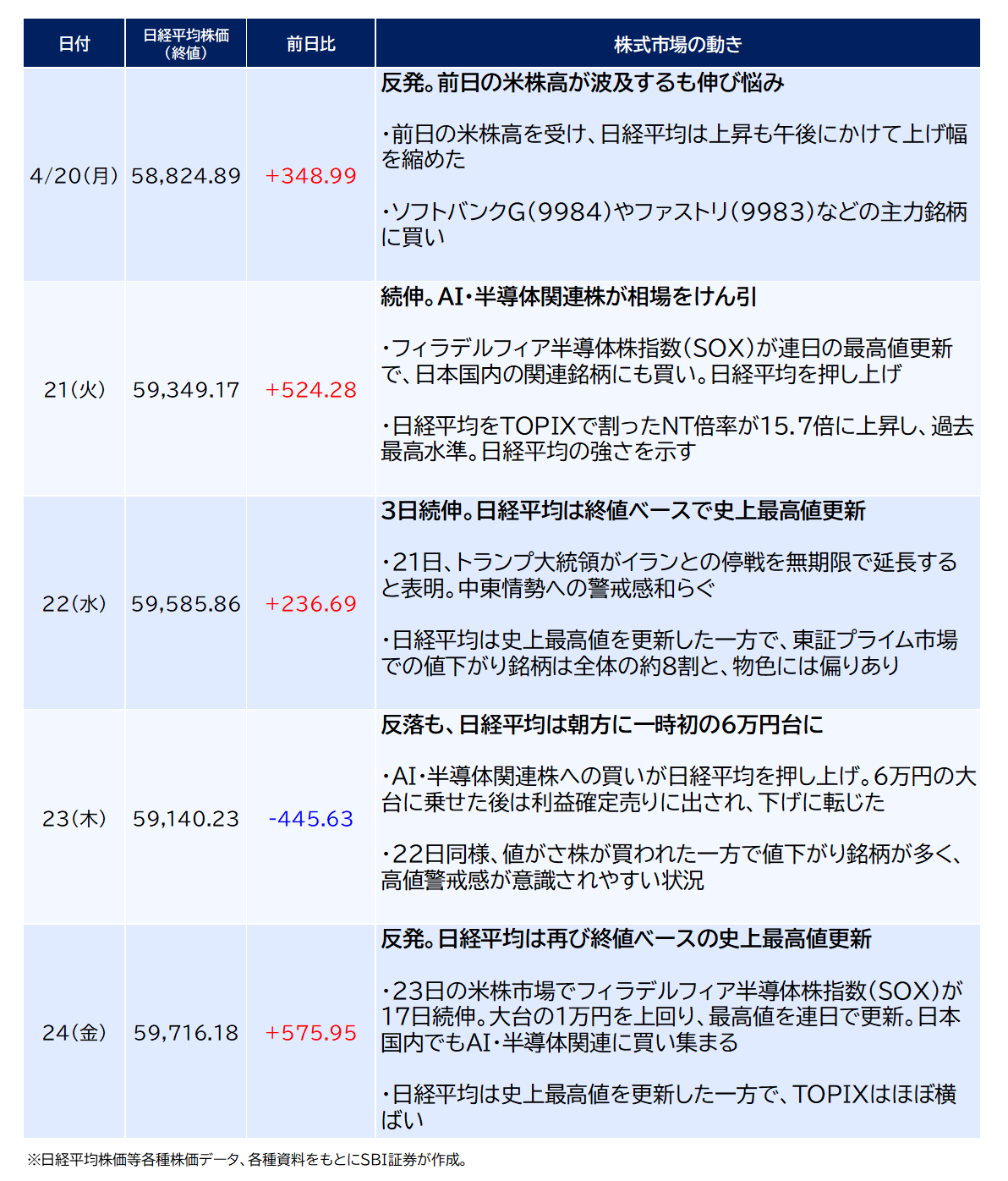 日経平均株価の4/24(金)終値は59,716円18銭で、前週末比1,240円28銭高(+2.12%)と週足ベースで3週続伸しました。