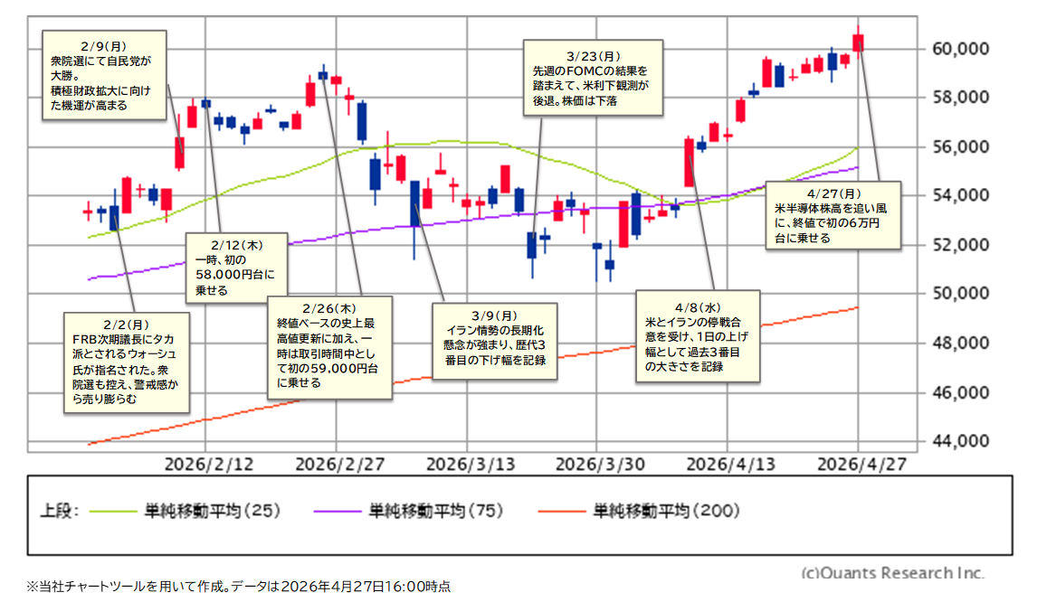 初の6万円台で取引を終え、取引時間中・終値ベースともに史上最高値を更新しました。米半導体関連株の上昇が相場の追い風となっています。