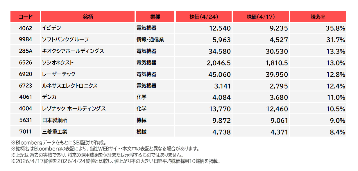 図表4 日経平均株価採用銘柄の騰落率上位(4/17-4/24)