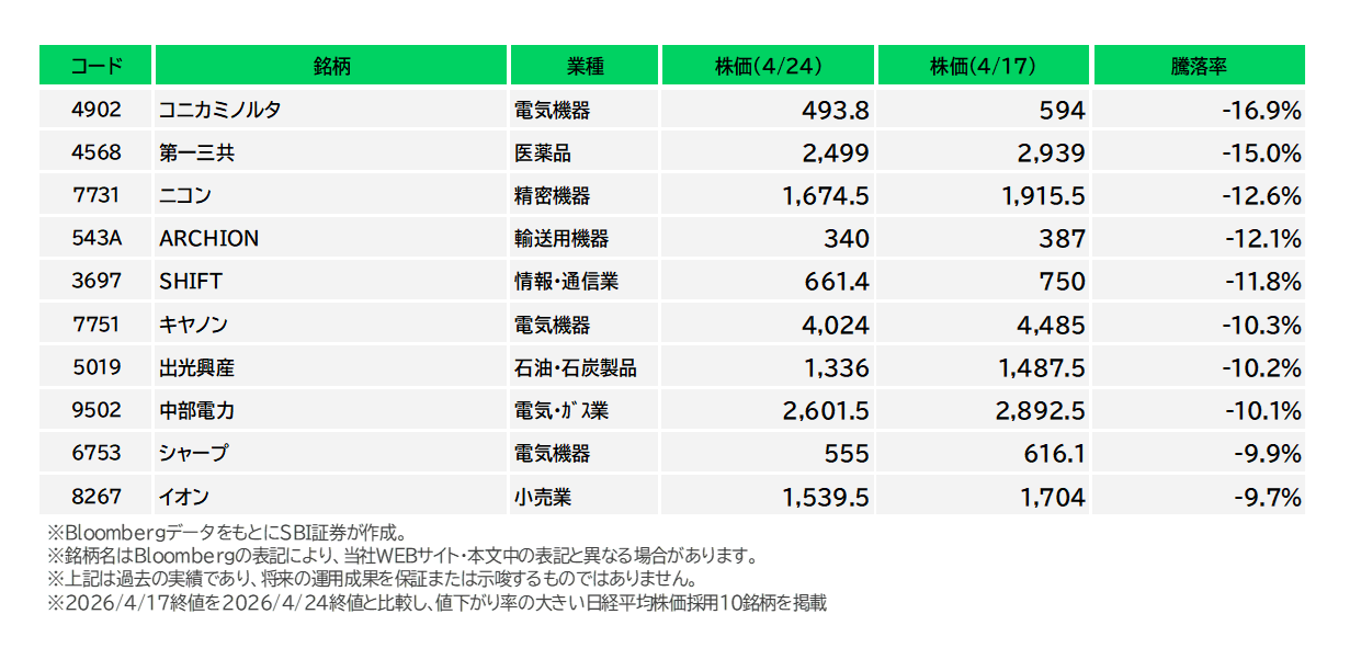 図表5 日経平均株価採用銘柄の騰落率下位(4/17-4/24)