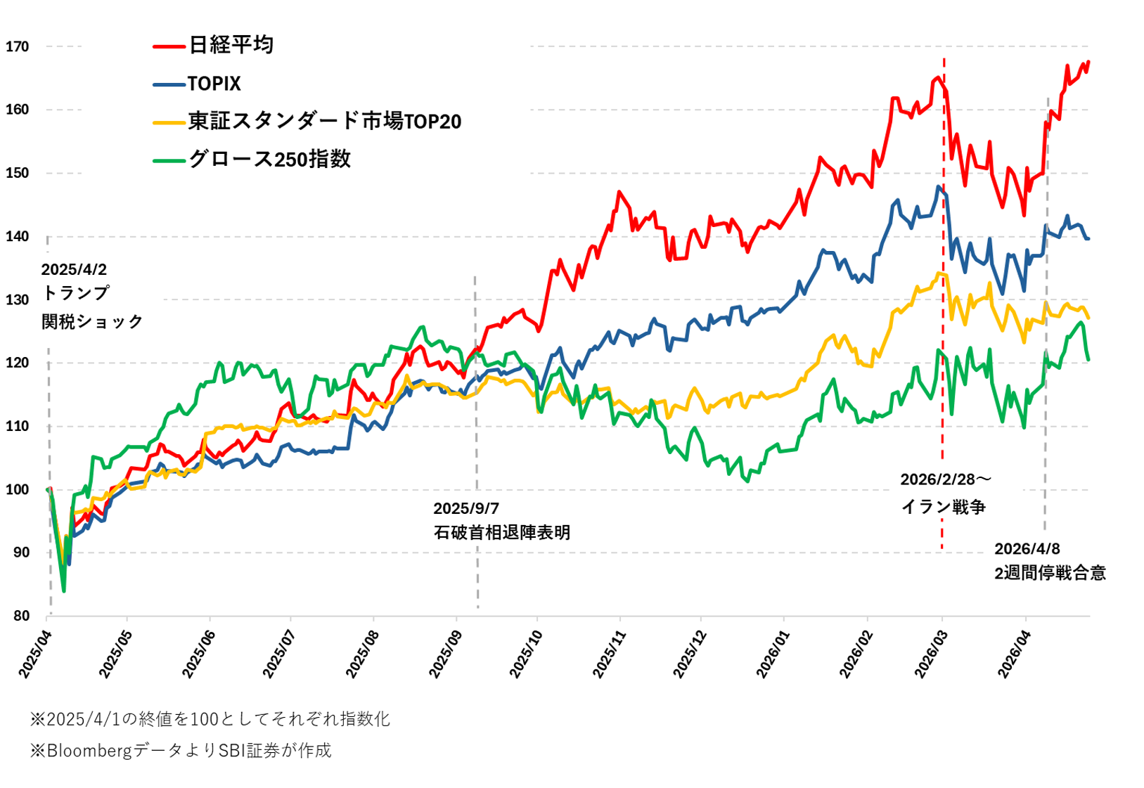 図表6 日経平均株価、TOPIX、東証スタンダード市場TOP20、グロース250指数の値動き比較(2025/4/1~2026/4/24)