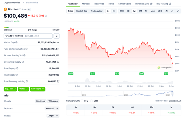 週前半は11万ドル前後でもみ合いでしたが、11/4にかけて下落が加速し、瞬間的に10万ドルを割り込む場面がありました。終値は10万ドル近辺で引け、中盤以降は戻り売りが勝る地合いでした。今回の下押しで、10/30の約10.83万ドル終値から週次ベースで7〜8%安の水準になっています。