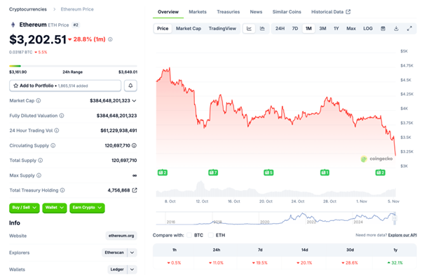 イーサリアムは3,900ドル台から3,100ドル台まで下落。日中のボラティリティも大きく、10/30終値3,803ドルから、11/4終値3,171ドルと週次で約17%安となっています。ビットコインに対して相対的な弱さが目立ちました。