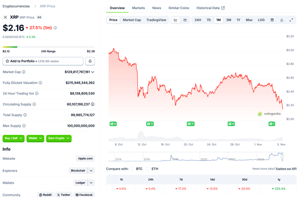 XRP:支持=15〜2.20ドル(11/4安値帯)/抵抗=2.30〜2.50ドル(直近レンジ上限)。