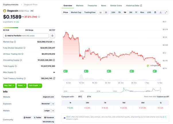 ドージコインは0.19ドル台から0.15ドル台に下落しました。10/30の0.1827ドル→11/4の0.1531ドルで週次約16%安で、短期資金の手仕舞いが優勢となりました。