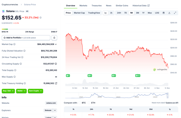 ソラナ:支持=150〜155ドル(11/4の引け・安値帯)/抵抗=165〜170ドル、次いで185〜190ドル。