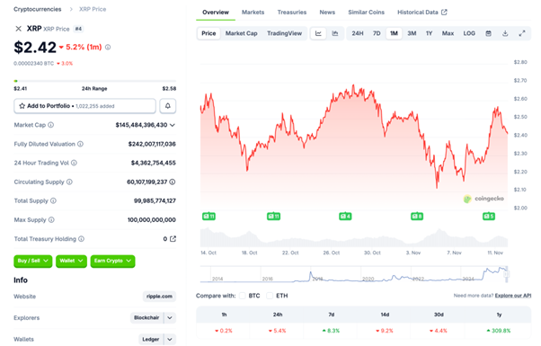 XRP(リップル)は2ドル台半ばを中心に往来。発行元のRippleが11/5に5億ドルの資金調達を実施し、評価額400億ドルが報じられるなど、基盤事業の強化が注目材料となりました。もっとも、現物ETFの正式承認はまだ流動的で、思惑先行の値動きには留意が必要です。